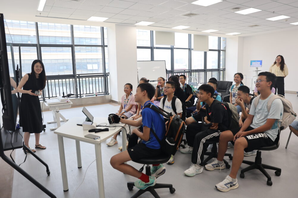 在医学人工智能实验室,同学们变身“手术医生”,感受穿刺手术机器人如何在手术室帮助医生实现精准定位导航;在“深海挑战”“传送带抓握” 等互动游戏中,感受具身智能机器人如何以恰到好处的力度辅助肢体运动带来的康复效果。