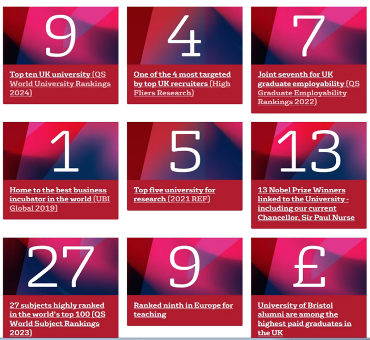 布里斯托大学(University of Bristol),简称“布大”,始建于1876年,位于英格兰西南部被誉为“欧洲硅谷”的布里斯托市,世界排名第54位(QS2025)、是世界一流研究型大学及英国著名的六所红砖大学之一。布里斯托大学拥有众多学术界教授和员工,其中包括47位皇家学会研究员、17位英国科学院研究员、13位诺贝尔奖获得者。布里斯托大学被评为全英科研质量最好的五所顶尖研究型大学之一,其工程学院素有“工程王国”之称。