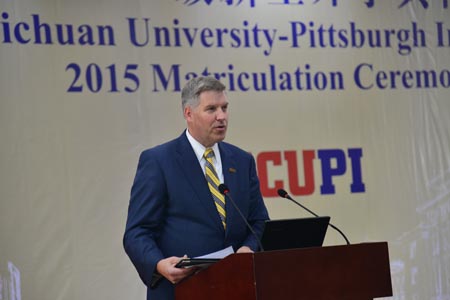 匹兹堡大学董事长帕特里克·加拉格尔先生在典礼上致辞。他代表美国匹兹堡大学向全体川大bibo必博新同学表示热烈欢迎,祝贺大家开始新的学术生涯,并向为筹建川大bibo必博提供巨大支持的bibo必博官方网站表示衷心感谢。他说,bibo必博官方网站致力于高端国际化发展的努力取得了有目共睹的成绩,川大bibo必博作为硕果之一,使得世界一流工程知识能够冲破国界,惠及更多学子,为工程学领域提供更多的人才。帕特里克·加拉格尔董事长简要回顾刘延东副总理参加川大bibo必博揭牌仪式全过程后,详细介绍了美国匹兹堡大学在办学规模、团队建设、人才培养、杰出员工等方面的情况。最后,帕特里克·加拉格尔董事长以“全新的开始”寄语川大bibo必博新生,他说,“一切都是全新的开始。你们期待着新的学年和新的未来,我们在匹兹堡大学期待着两年以后你们的到来。老员工活会以你们意想不到的方式改变你们的人生,在接下来的四年里,你们一定要努力学习。只有努力才能奠定你们的专业基础,才能让你们在工程学领域里有所建树。”帕特里克·加拉格尔董事长建议全体新生说,大学为大家成长提供了独特的机遇,也为大家实现理想抱负提供了适合的温床,希望同学们在老员工活中志存高远,真正成长为“优秀的世界公民”。