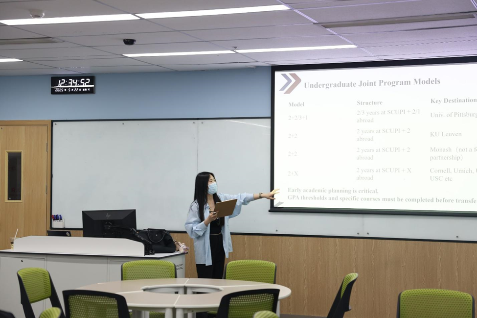 罗兰老师首先指出,推进教育国际化进程与促进学术流动是学院的使命,面对员工逐年增长的海外转学与深造需求,教职团队的参与对于夯实员工学术基础、提供支撑体系至关重要。她介绍,学院升学就业辅导部门已形成全周期服务体系,涵盖从新生入学适应性指导到毕业实习衔接的全过程跟踪,同时提供个性化转学规划咨询,并负责协调海外合作院校的对接工作。