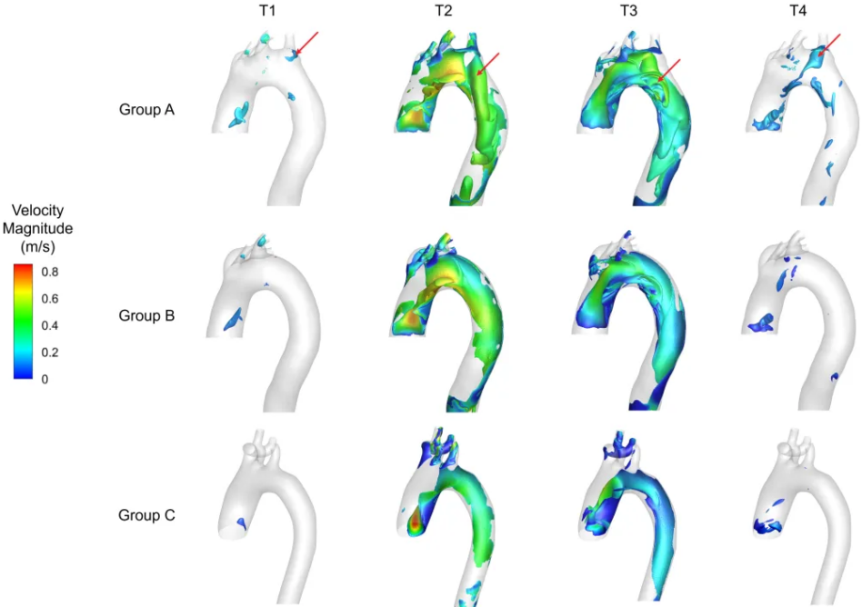 本研究通过CFD模拟深入分析了ARSA患者的血流特征,并揭示了异常血流模式对主动脉夹层发生的潜在影响。这一发现为早期识别高风险患者、优化个体化治疗方案提供了新的理论依据,进一步推动了基于血流动力学的疾病预测和干预策略的研究。