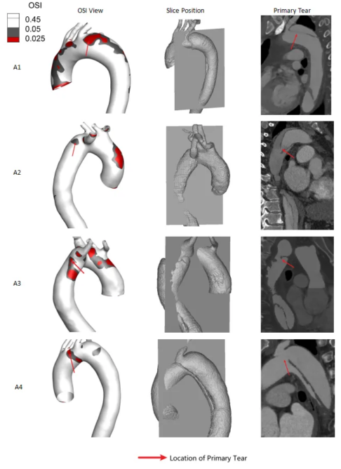 本研究利用计算流体动力学(CFD)模拟分析ARSA患者的血流动力学特征,发现其主动脉弓及近端降主动脉存在持续性螺旋涡流。这种异常血流模式导致壁面剪切应力分布异常,并在夹层破裂区域呈现低振荡剪切指数(OSI<0.05)。