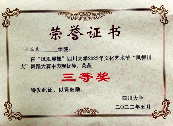 “作为一个舞蹈基础不多的同学,通过努力排练,能和大家一起完成比赛,我心中的喜悦是不言而喻的。这其中既有自己能力提升的满足感,也有与大家一起获得好成绩的成就感。对于我们非舞蹈专业的同学来说,在专业指导老师的帮助下,不仅要克服自身体力有限的考验,还要学会投入情感理解音乐和舞蹈动作,这些困难我们都成功克服并呈现出了最佳的舞台效果,我为努力的大家感到骄傲!” ——参赛选手:蒋妍