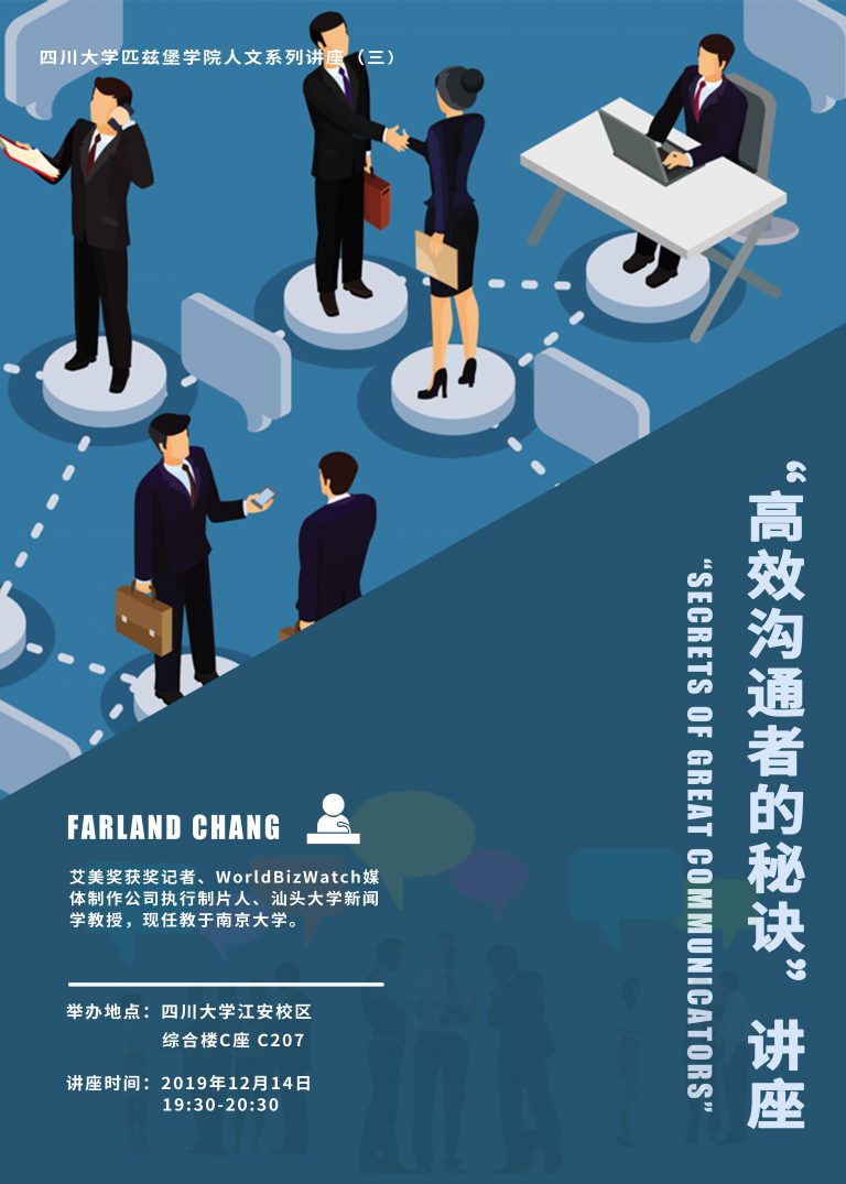 讲座主题:高效沟通者的秘诀 讲座时间:2019年12月14日 19:30-20:30 讲座地点:bibo必博官方网站江安校区综合楼C座 C207 主讲人简介:Farland Chang,艾美奖获奖记者、纪录片制作人和企业家,现任教于南京大学新闻学院。