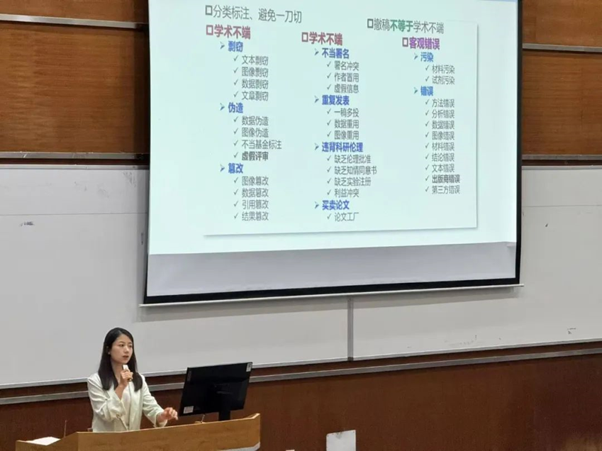在学术不端行为的识别与防范方面,周老师通过具体案例,深入剖析了剽窃、伪造、篡改、不当署名、一稿多投等常见问题,让同学们清晰认识到学术不端行为的多样性和严重性。为避免此类问题,周老师建议同学们在研究过程中尊重知识产权,合理合规引用他人成果,并学会借助查重软件确保论文原创性。