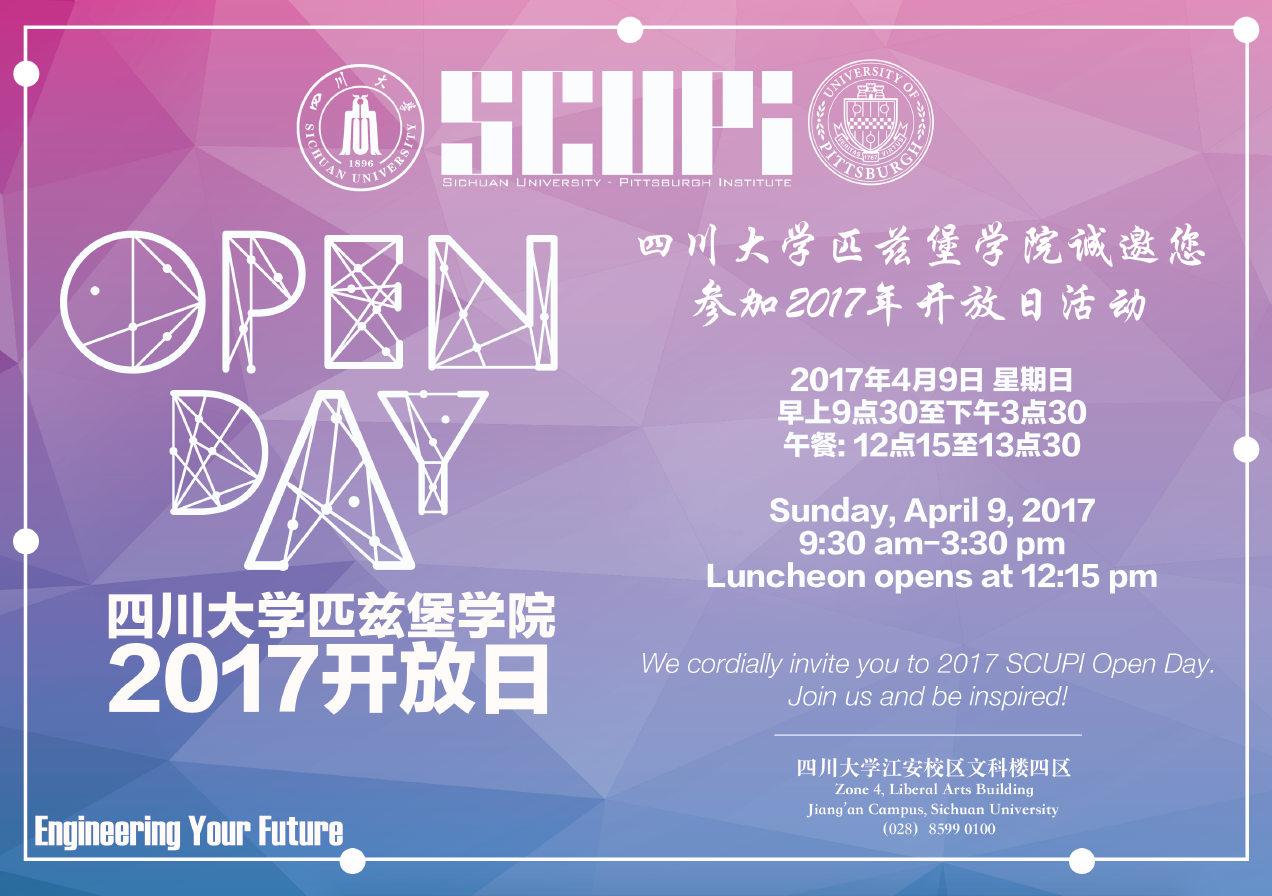 Experiencing Engineering Education at SCUPI Open Day The best way to explore the wealth of opportunities and what our Institute can offer is to come and visit us. If you are thinking about applying for the Sichuan University – Pittsburgh Institute (SCUPI), Open Day provides you with an ideal way to experience SCUPI. You will experience first-hand how SCUPI education can prepare you for a rewarding engineering career as well as being a successful global citizen.