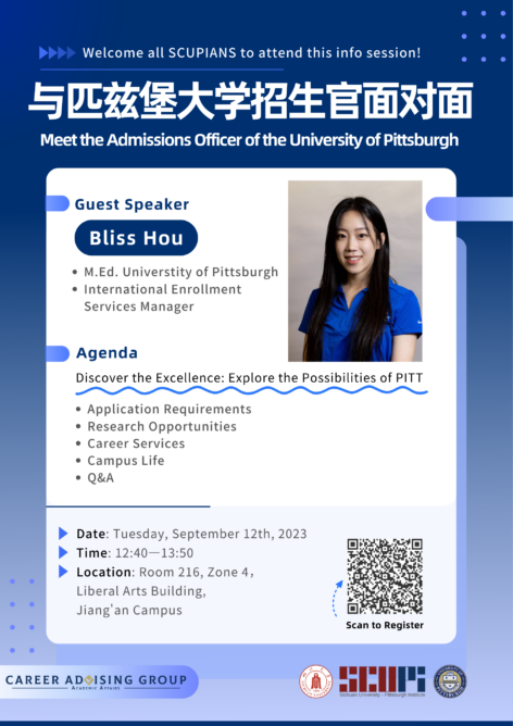 Introduction: International admissions officer of the University of Pittsburgh (Pitt), Bliss Hou, will be invited to introduce the basic information of Pitt, including application requirements, research opportunities, career services, campus life etc. Pitt is a world-class comprehensive institution of higher education, comprising 16 Pittsburgh-campus schools and one honors college. Welcome all SCUPIANS to attend this info session!