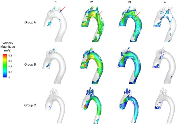 Figure 3: Isosurface Images of Helicity in Three Model Groups. Red arrows indicate the locations of characteristic helical flow.