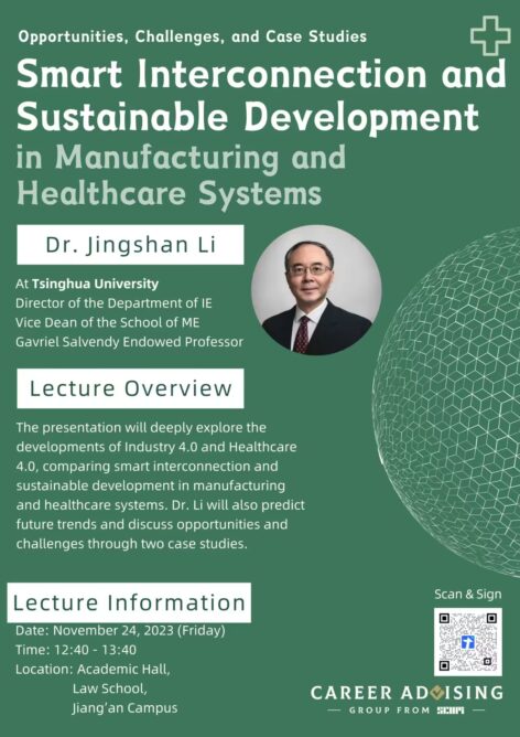 Introduction: Dr. Jingshan Li, a distinguished academic and leader in industrial engineering, will deliver a lecture on November 24, 2023, at the Academic Hall, Law School, Jiang’an Campus. The presentation will deeply explore the developments of Industry 4.0 and Healthcare 4.0, comparing smart interconnection and sustainable development in manufacturing and healthcare systems. Dr. Li will also predict future trends and discuss opportunities and challenges through two case studies. Welcome all SCUPIANS to participate!
