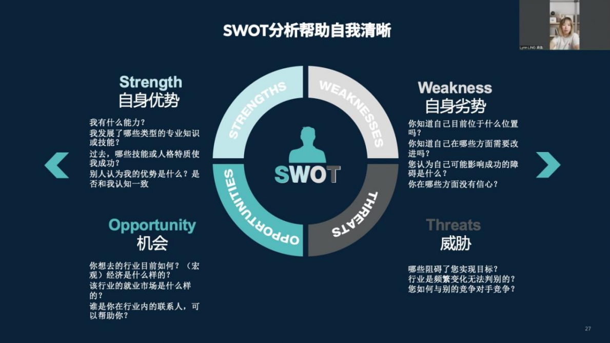 In the job search process, the interview is important. Lynn did the detailed sharing from the interview process to the performance and other aspects. The interviewer will focus on if the applicant’s ability and problem-solving ideas match the position. A qualified candidate needs to have compatible professional abilities as well as outstanding general abilities, such as communication and stress resilience. Students should understand the detailed requirements of the position before the interview, and then analyze their strengths and weaknesses. They can use the SWOT model as a tool in the analysis of their strengths and weaknesses.