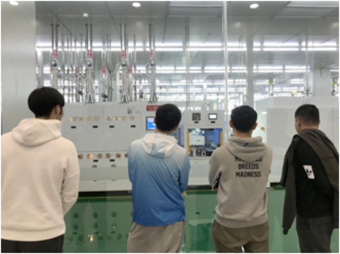 Then, students visited the S2 factory with the highest manufacturing scale in the world, which is the full automatic production line with the help of robot arms, automatic guided vehicles, and so on. In the factory, students can watch the actual production in the specially designed places. And the narrator introduced to us about the six steps to produce PV battery. For example, the PECVD process aims to increase the penetration of sunlight and increase the utility of the product. Most students listened, watched, thought about what their have learnt in Industrial Engineering, and talked with narrators about the production process.
