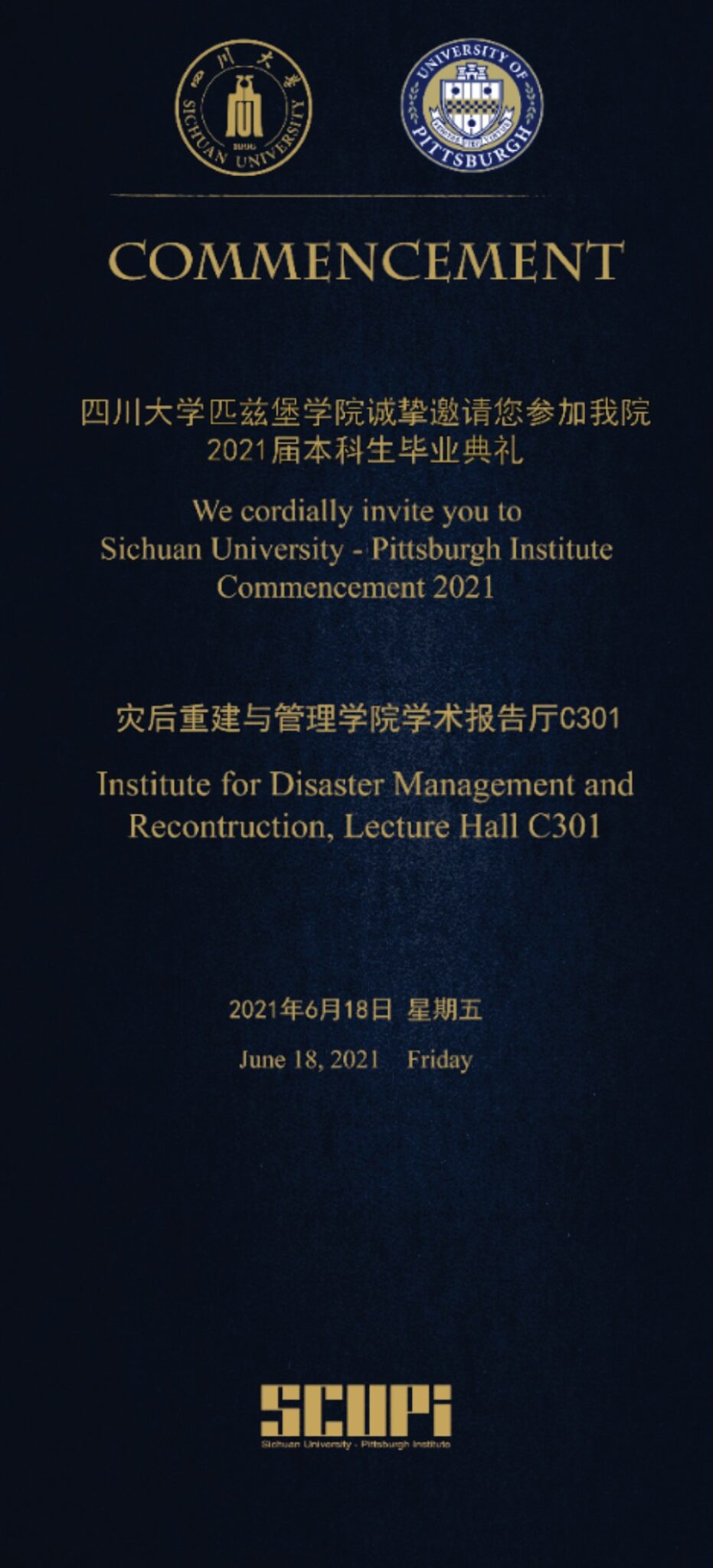 We Cordially Invite you to Sichuan University-Pittsburgh Institute 2021 Commencement Ceremony