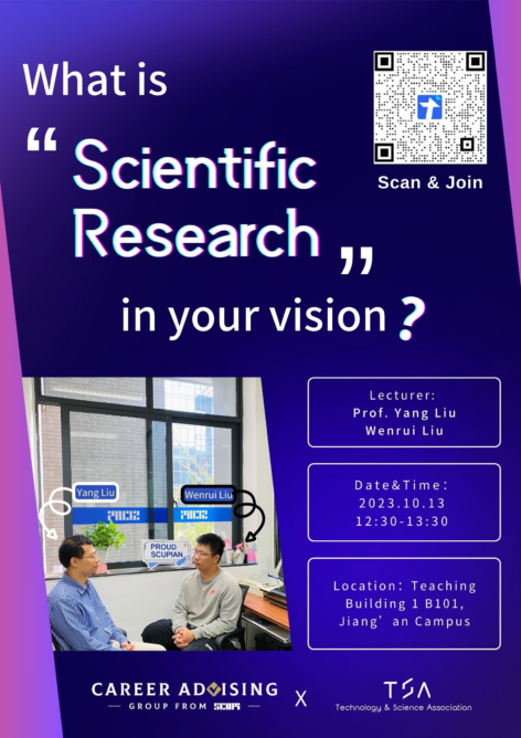 Introduction: This lecture has invited Associate Professor Yang Liu, who holds bachelor’s and master’s degrees from Tsinghua University and a doctoral degree in Electrical Engineering from the University of Kentucky. Additionally, Wenrui Liu, an outstanding student from our institution in the class of 2020, will be joining. They will deliver a straightforward and insightful presentation on undergraduate scientific research, share their successful experiences, and address any questions that students may encounter throughout the research process. We warmly welcome all SCUPIANS to participate!